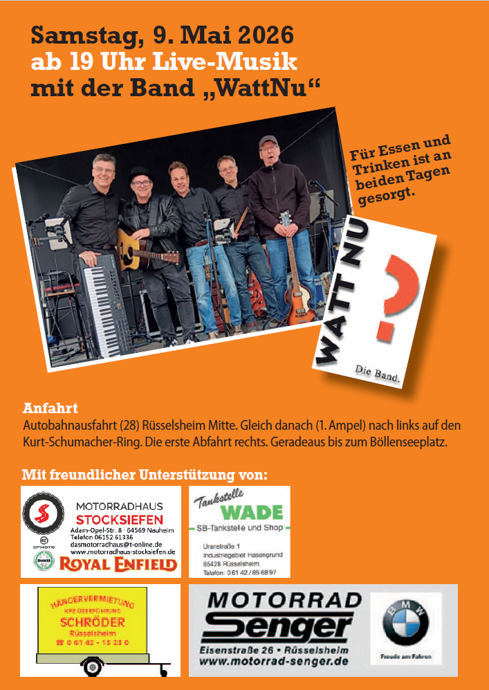 Dort wird auch der Familiennachmittag am Samstag mit einem bunten Kinderprogramm stattfinden, sowie der Bikergottesdienst am Sonntagvormittag mit anschließender Segnung und begleiteten Ausfahrten, die wieder in den bewährten Händen des Motorsport und Touristik Club Rüsselsheim e.V. (MTCR) liegen werden!